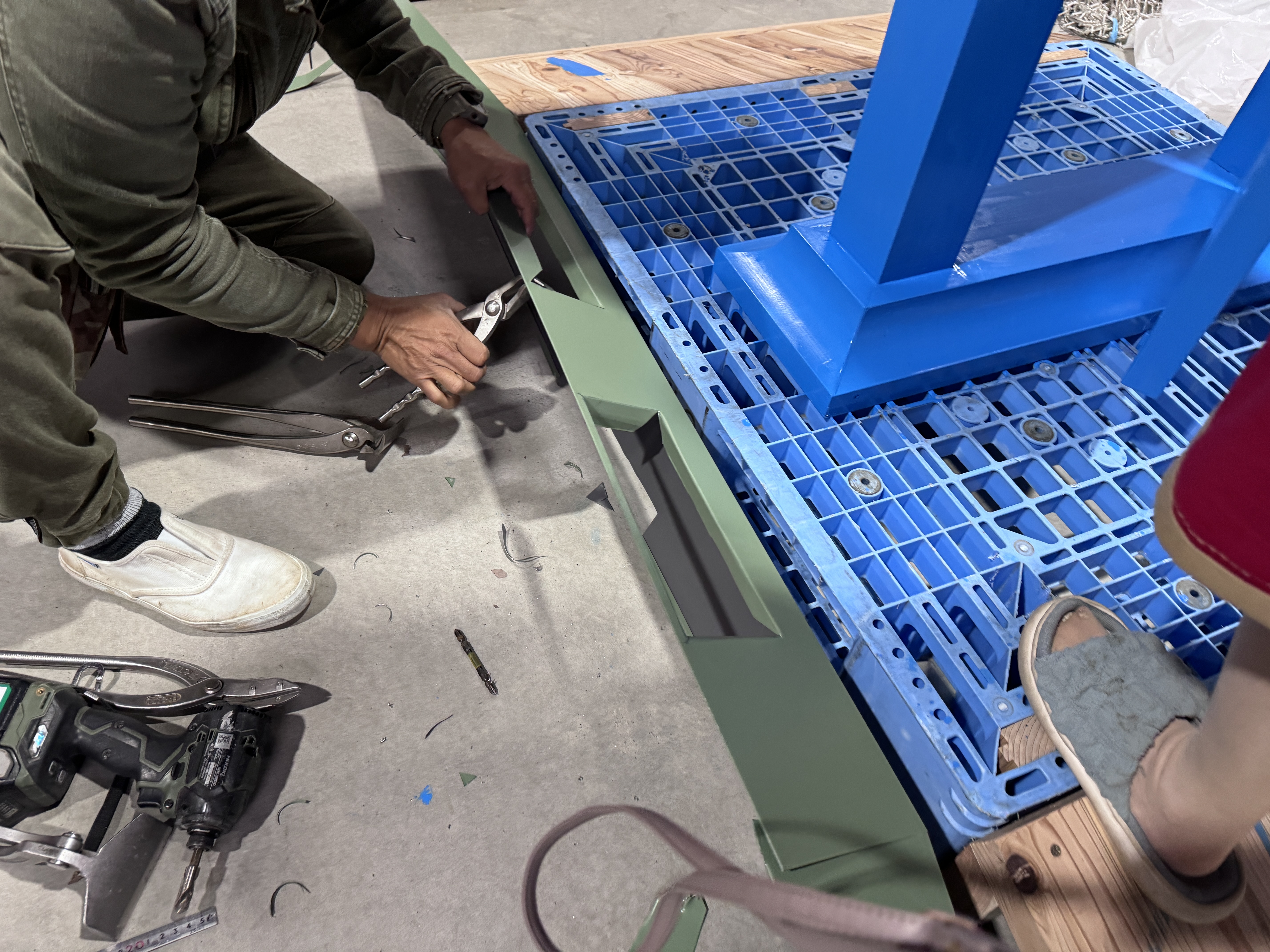 さてどうしましょう。買い足すか?緑に塗るか?いろいろ案が出ましたが、我が職長が素晴らしい板金の技術で綺麗に覆ってくれました。