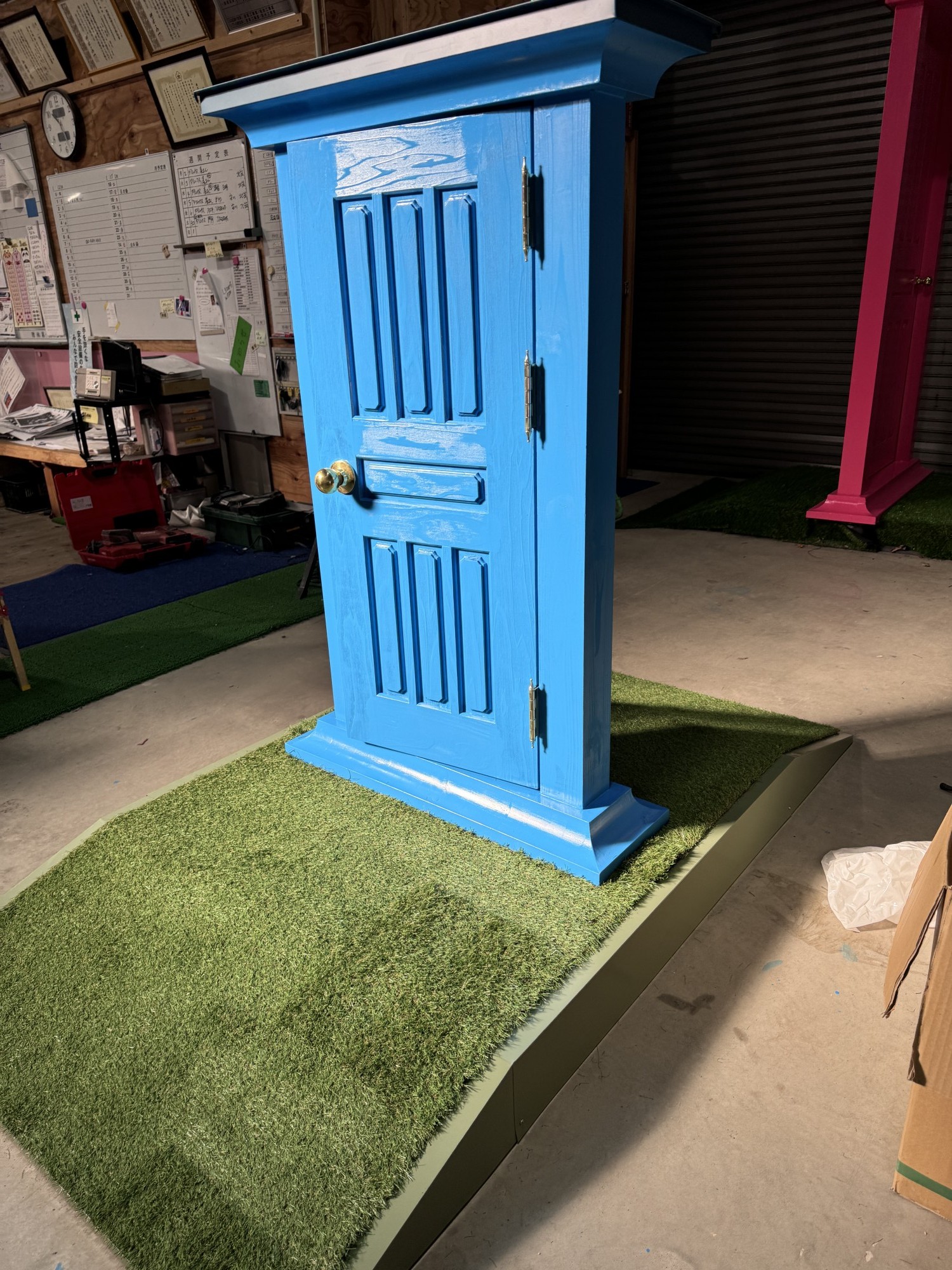 ピンクのドアをドラ〇〇〇が置いて行ってくれてその後ミニ〇〇が青のドアを置いて行ってくれたみたいです。